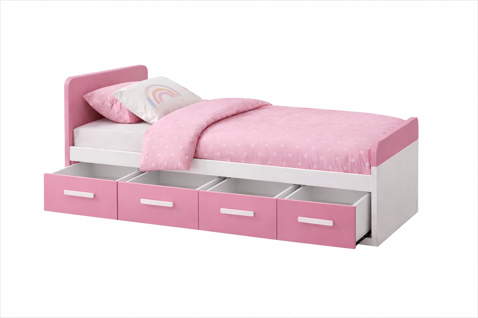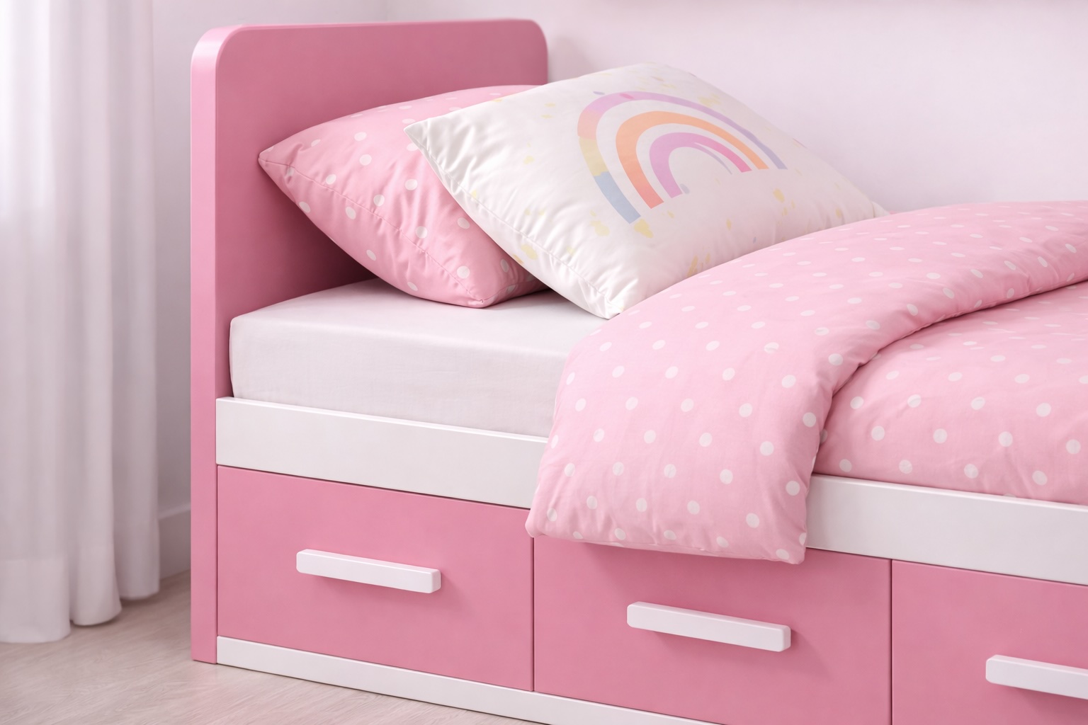 Кровать оснащена удобными ящиками, которые позволяют хранить постельное белье, игрушки или сезонные вещи. Это особенно важно для небольших комнат.