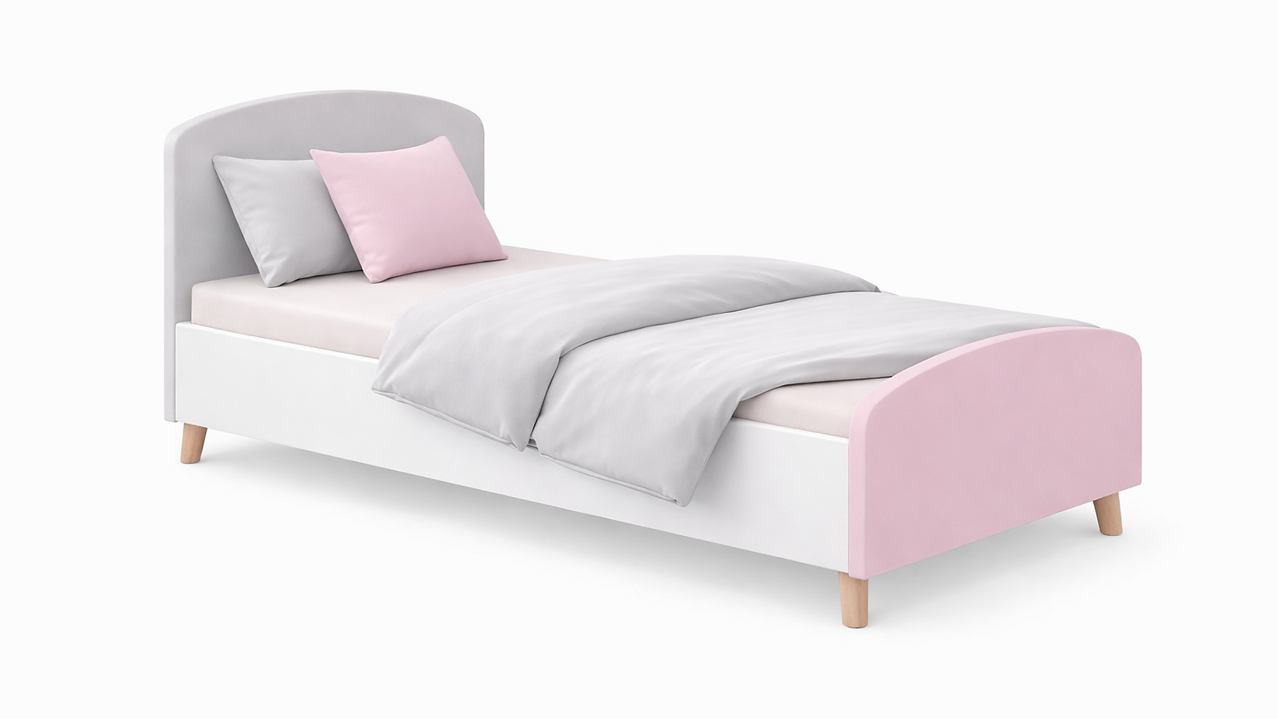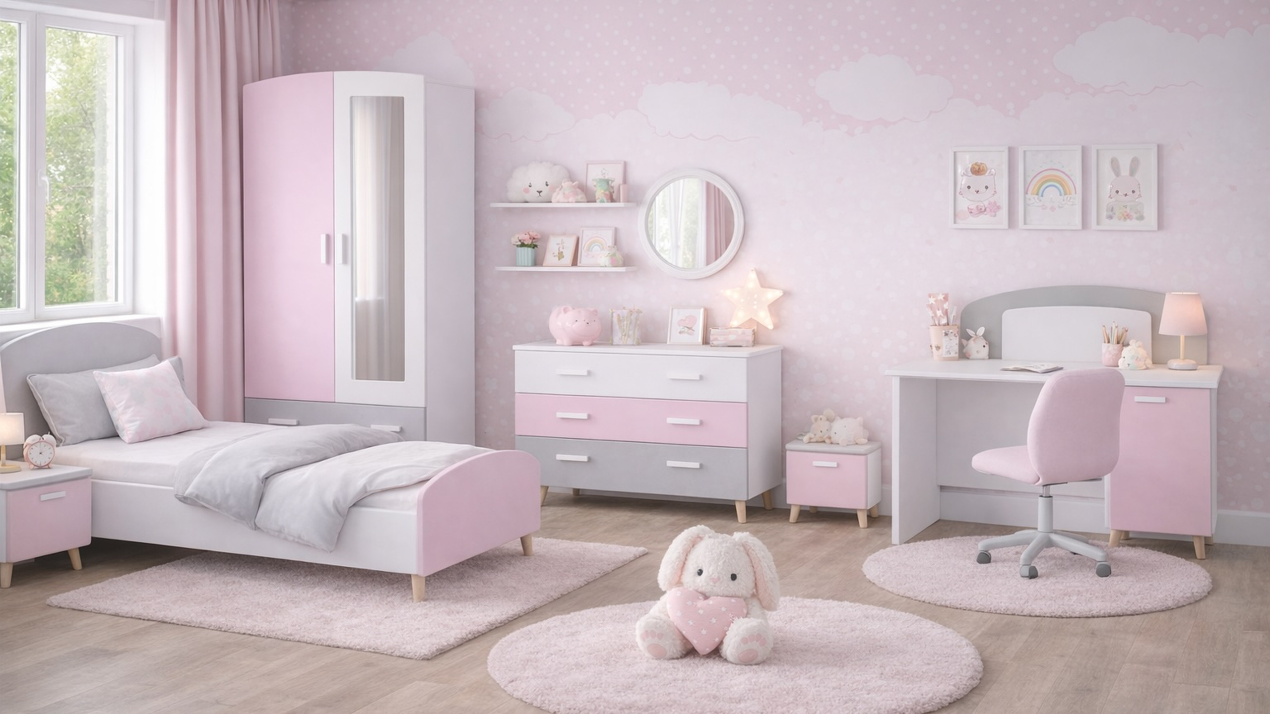 Мебель выполнена в нежной цветовой гамме, сочетающей белый, серый и розовый оттенки. Такой дизайн делает комнату светлой, уютной и идеально подходит для детской спальни девочки.