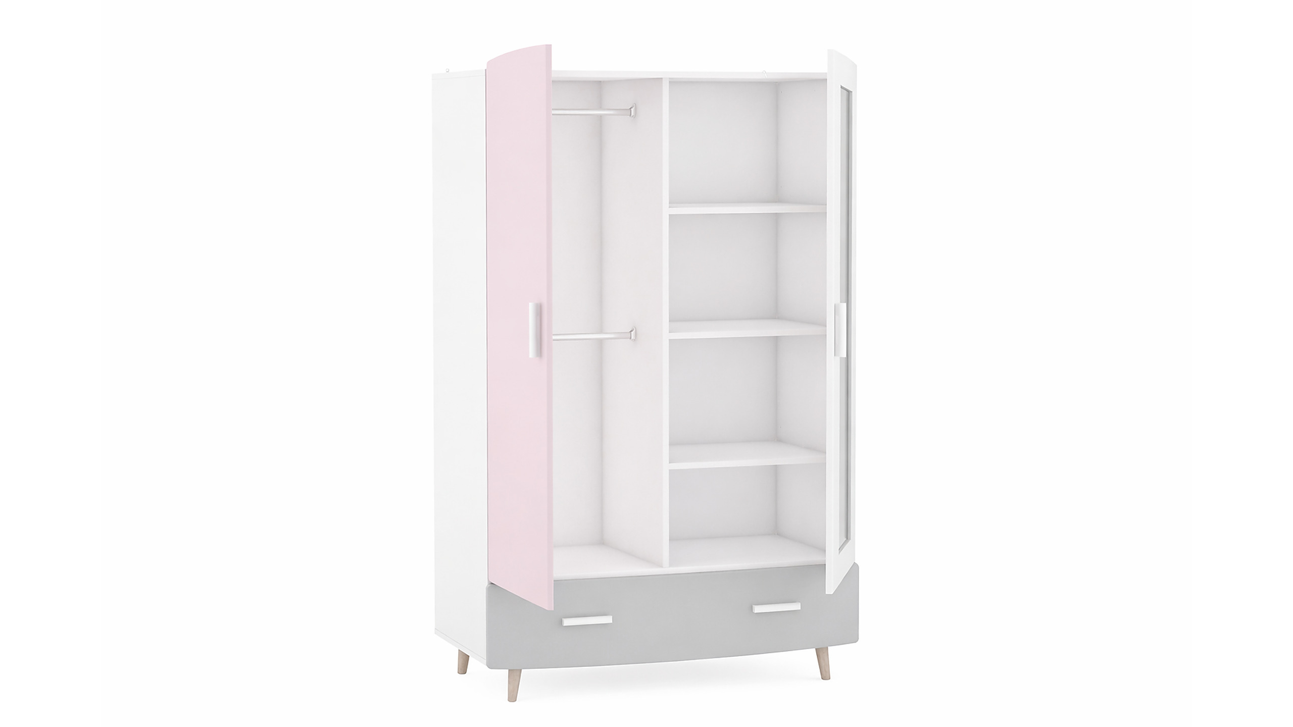 Шкаф оснащен двумя дверцами, полками, отделением со штангой для одежды и вместительным выдвижным ящиком в нижней части. Такое наполнение позволяет удобно хранить одежду, белье, игрушки и другие детские вещи.