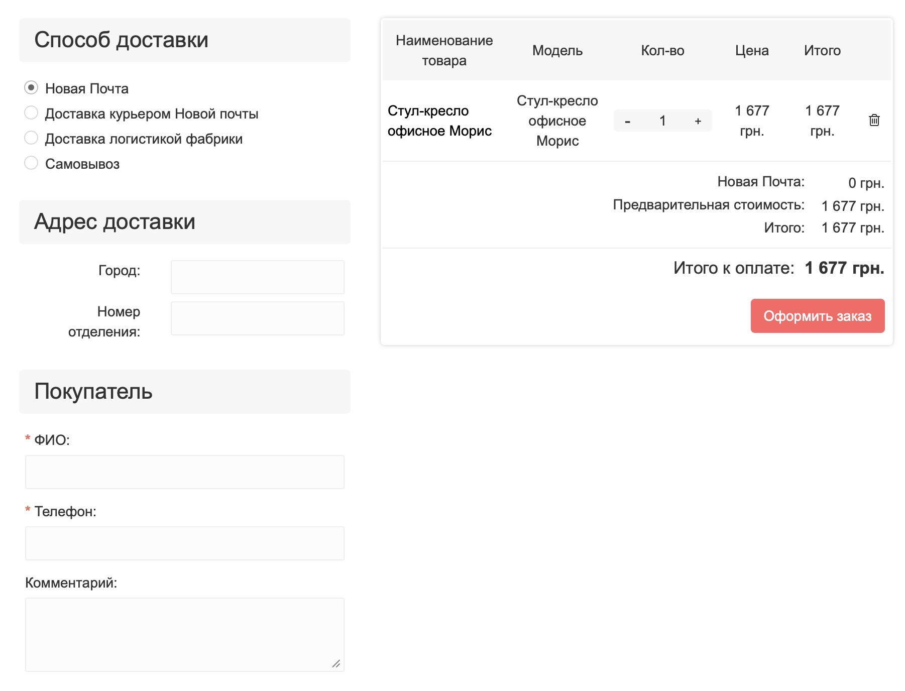 Натисніть кнопку Оформити замовлення. Ви перейдете до нової сторінки, на якій потрібно вибрати спосіб доставки і заповнити порожні поля. Там все легко та просто.