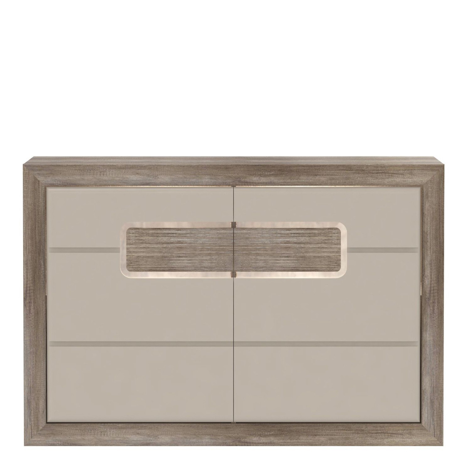 Сучасний комод з незвичайним зовнішнім виглядом, який стане привабливим акцентом і одночасно підвищить функціональні можливості інтер'єру. Каркас має колір античного дуба св поєднанні з бежевими глянцевими фасадами. Це предмет меблів для людей, що цінують функціональність в поєднанні з цікавим дизайном. Його призначенням може бути практично будь-яка кімната в будинку.