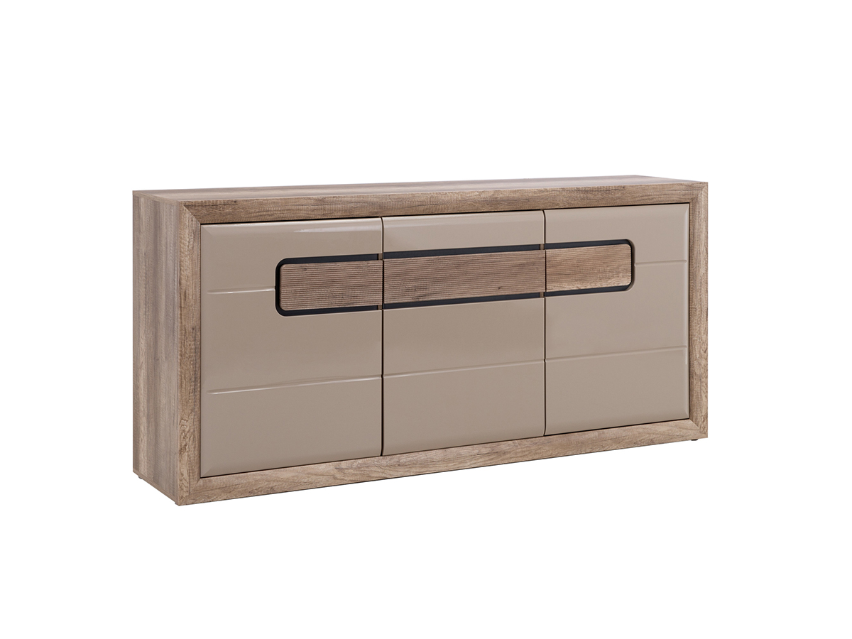 Сучасний комод з незвичайним зовнішнім виглядом, який стане привабливим акцентом і одночасно підвищить функціональні можливості інтер'єру. Каркас має колір античного дуба св поєднанні з бежевими глянцевими фасадами. Це предмет меблів для людей, що цінують функціональність в поєднанні з цікавим дизайном. Його призначенням може бути практично будь-яка кімната в будинку.