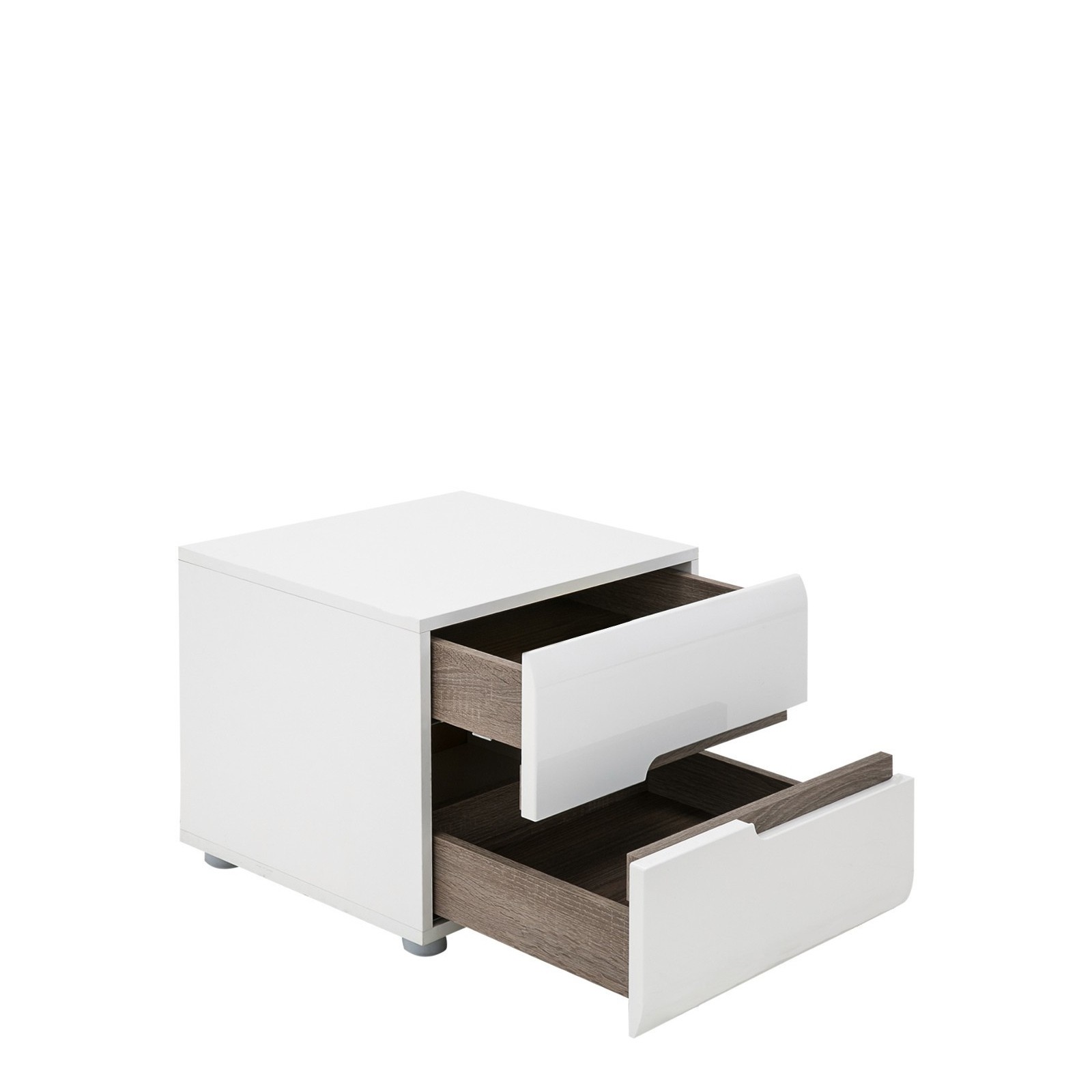 Тумба приліжкова 2 Моніка – це ідеальне рішення для людей, які цінують унікальний стиль та стежать за останніми тенденціями. Все виконано в білих тонах, що гарно поєднуються з наповненням трюфельного кольору. Фасади МДФ, покриті плівкою ПВХ в білому глянці, оптично збільшать інтер'єр і гарно гармоніюватимуть з іншими квітами. Скляні полиці з підсвічуванням прикрашають меблі та підкреслюють фактуру задньої стіни.
