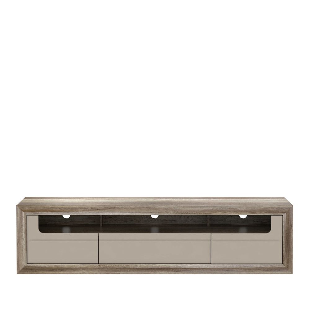 Сучасний комод з незвичайним зовнішнім виглядом, який стане привабливим акцентом і одночасно підвищить функціональні можливості інтер'єру. Каркас має колір античного дуба св поєднанні з бежевими глянцевими фасадами. Це предмет меблів для людей, що цінують функціональність в поєднанні з цікавим дизайном. Його призначенням може бути практично будь-яка кімната в будинку.